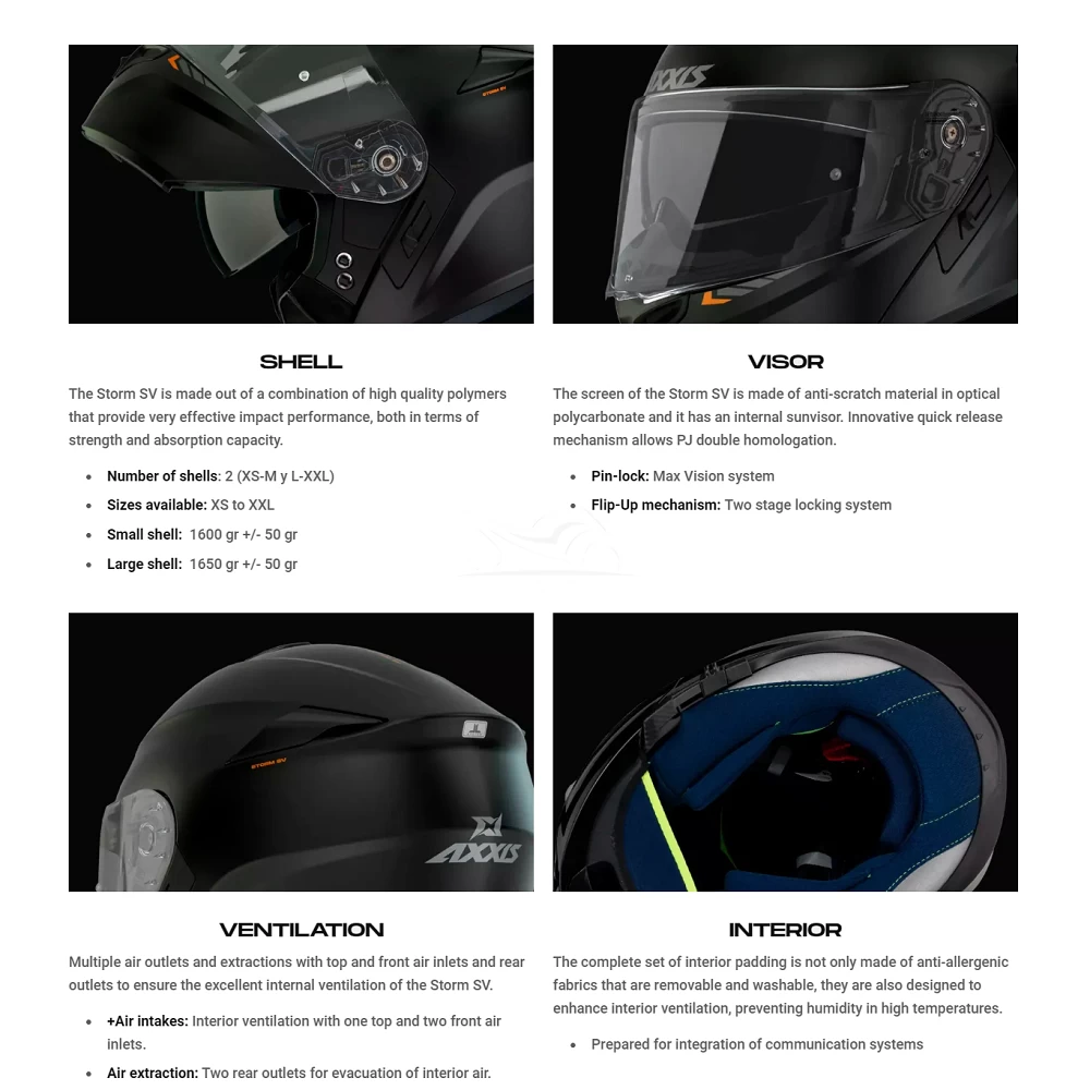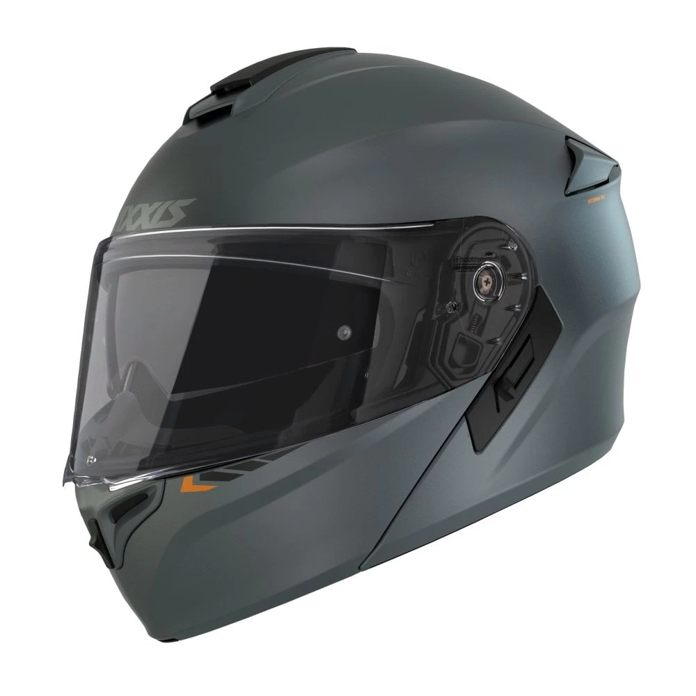 The Axxis Storm plain motorcycle helmet is a sporty modular helmet, ideal for both daily use and long distance trips. The flip up motorcycle helmet comes with a P/J homologation, ensuring the helmet is safe when the chin bar is either raised or lowered. A dual visor system allows you to tackle the road in any riding conditions, and in particular battle sun glare with an inner sun visor. A fully removable hypoallergenic lining ensures that your interior remains fresher longer, and is a dream to keep in top condition. Available in a range of colours to match any riders gear, bike and personal taste!