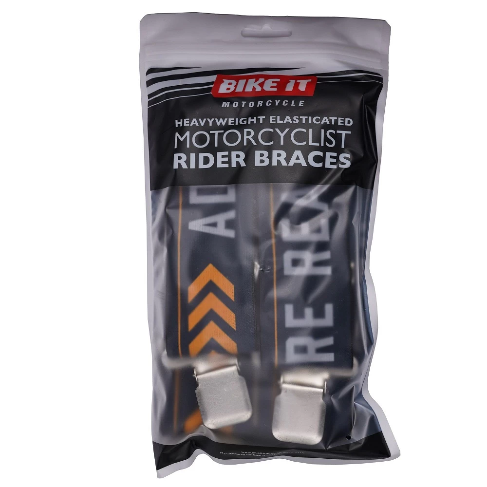 The Bike It Adventure motorcycle braces have been designed specifically for use with leather and textile motorcycle trousers. No longer will you forever be pulling your trousers up, eliminate the problem with a set of comfortable braces designed for riding. Available in a range of colours to match any riders gear, bike and personal taste!