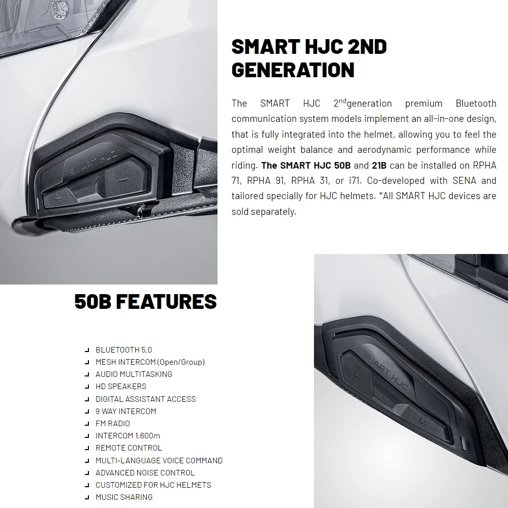 Based on the BT 5.0 low power system, the 50B (based on SENA 50S/50R) features both the MESH intercom and 4-way Bluetooth intercom features. The enhanced sound system properties include audio multi-tasking, sound equalizing, advanced noise-canceling, and more. The SMART HJC 2nd generation also comes equipped with HD speakers to enrich mid-to low-pitched sounds. All of this can be effortlessly controlled through the SMART HJC mobile app from your phone.