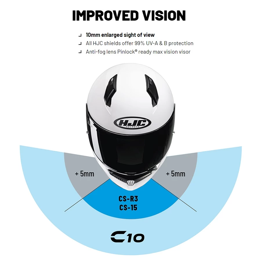 10 mm Enlarged sight of view. All HJC visors offer 99% UV-A & B protection. Anti-fog lens Pinlock® ready max vision visor.
