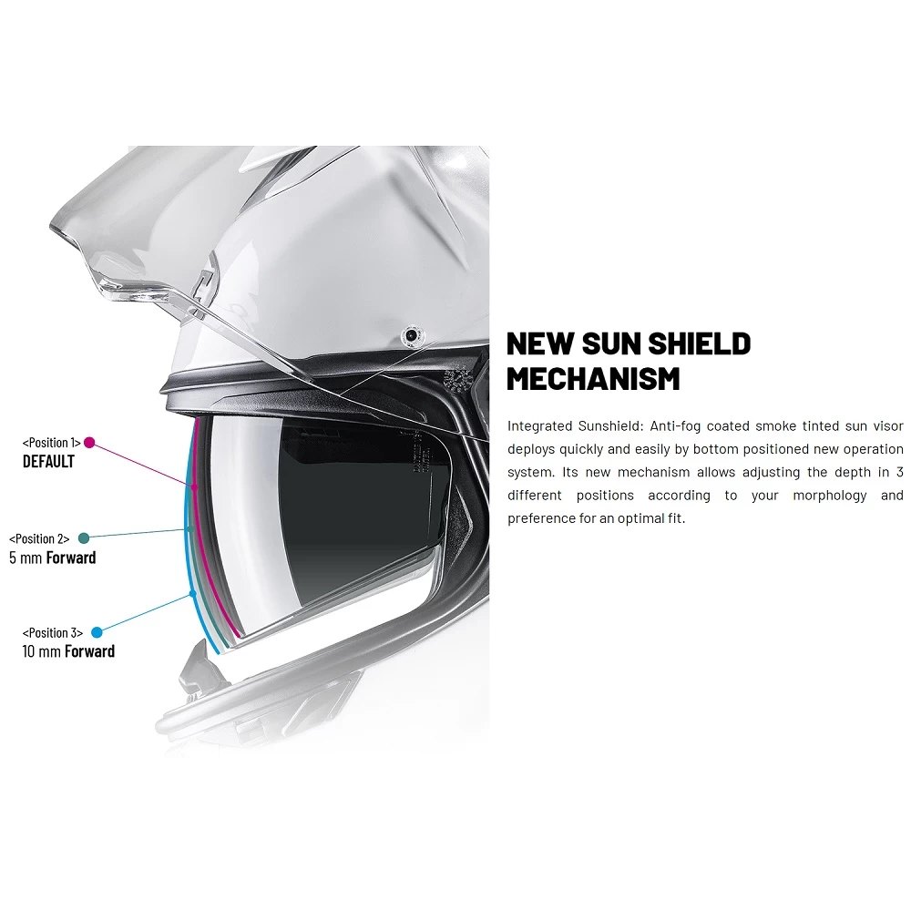 Integrated sun-shield. Anti-fog coated smoke tinted sun visor deploys quickly and easily. Its new mechanism supports 3 adjustable positions according to your morphology and preference for an optimal fit.