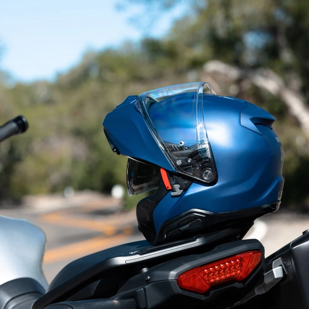 - It’s now possible to lock the chin bar when you want to ride with it in the open position for a safer ride. The chin curtain retracts when the helmet is in the open position to make it easier to put on and reduce wind resistance. In addition, the bottom locking system automatically hides in the open position to reduce wind noise and air resistance. The new two-way pivot chin bar allows the helmet to be more compact (lower than before) while open to reduce wind noise and air drag.