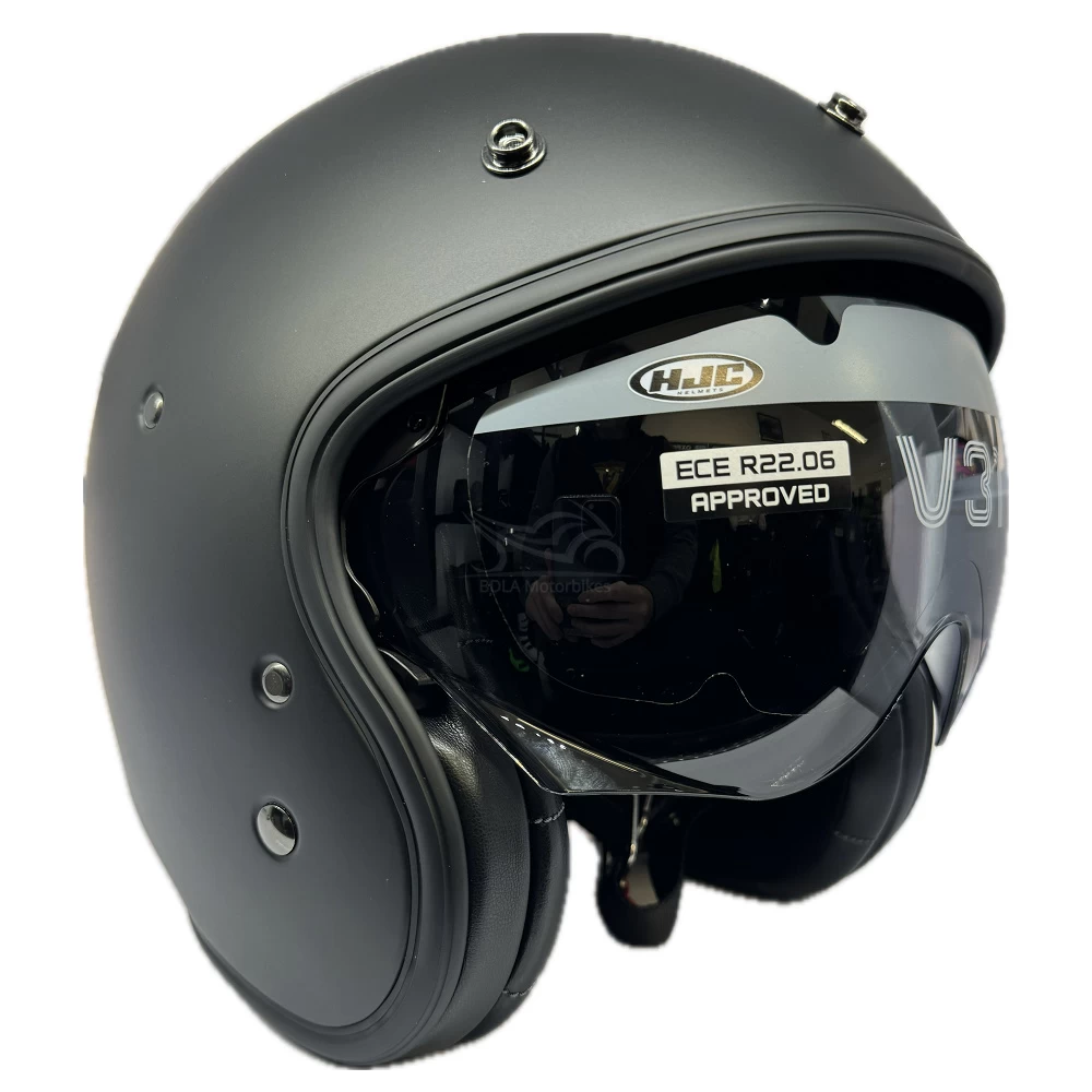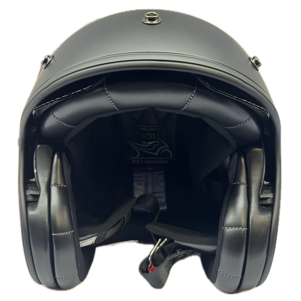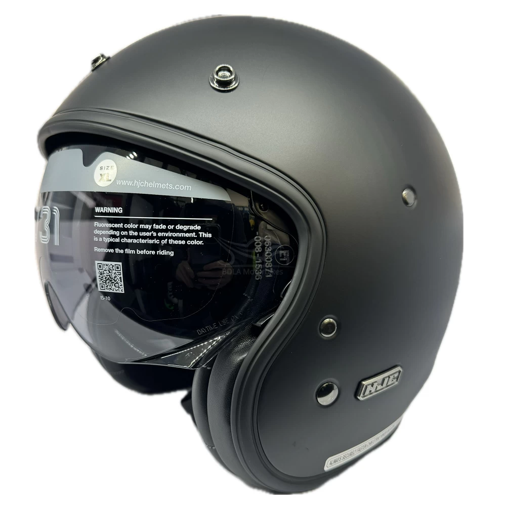 The HJC V31 plain open face motorcycle helmet is a retro-style scooter helmet perfect for touring riders looking for old school styling with modern day technology. Constructed using an advanced fiberglass shell, the motorbike helmet is lightweight and delivers both superior fit and comfort using advanced CAD technology. An integrated 3 position sun shield with anti-scratch coating effortlessly deploys up or down. To enhance the vintage feeling the HJC V31 plain motorcycle helmet is fitted with a premium leather and suede interior. Available in a range of colours and designs to match any riders gear, bike and personal taste!