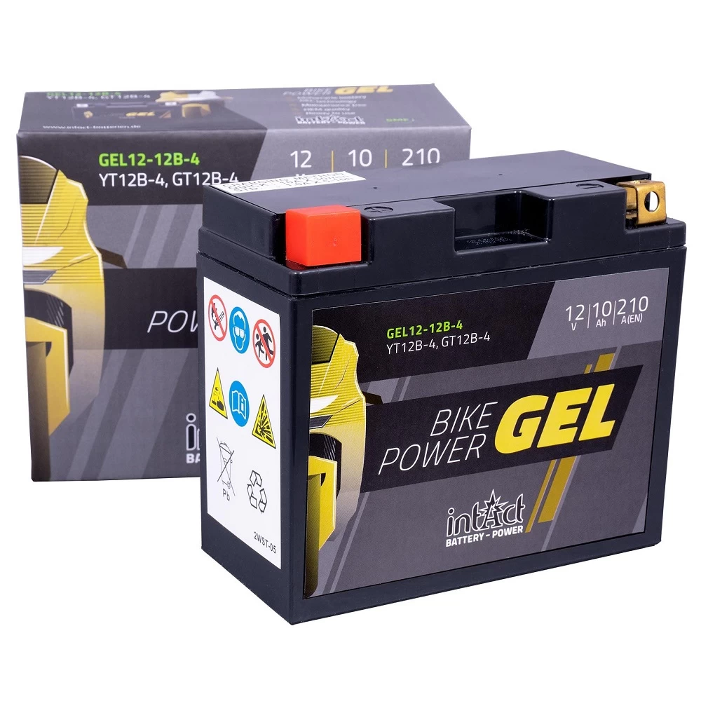 The Intact GT12B-4 Gel Motorcycle Battery is a fully sealed GEL battery, which is factory activated, supplied pre-charged and require no acid-filling to get started. A premium ready-to-use high performance battery, the GEL motorbike battery offers greater charge-cycle performance over AGM and SLA batteries of same case size. These are particularly suited for modern motorcycles and scooters with ABS and additional electrical devices. Offering 30% more starting performance than conventional flooded batteries, with great starting reliability and longevity all year round. GEL are completely maintenance-free and offer incredible vibration resistance.
