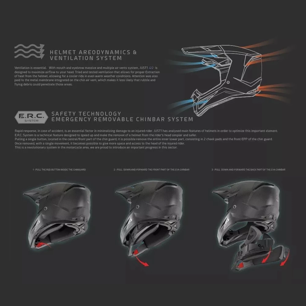 The Just1 J22 Frenetik motocross helmet is the perfect choice for competition riders looking for optimal blend of safety, style & performance. Just1 have spent countless hours into off-road research, aimed at improving technical features throughout which elevate your safety and comfort, no matter how hard you ride. An emergency release peak is designed to quickly remove itself during impact. When used with the peak extender and roost guard, you can also ensure you’re further protected from debris as you ride.