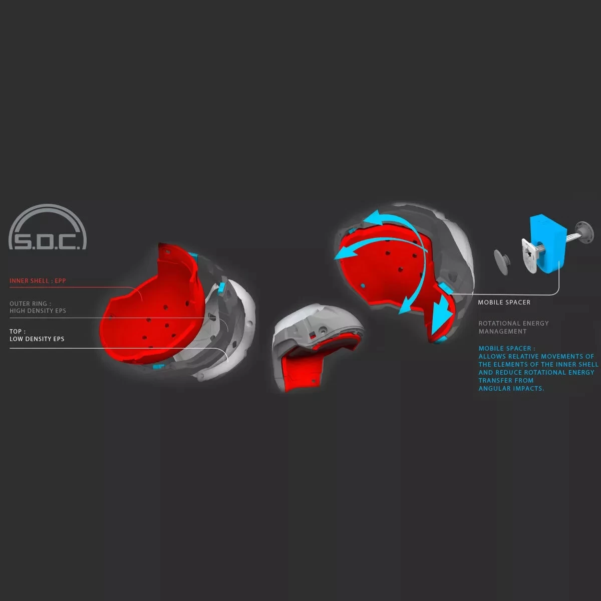 - Actively dissipates linear and rotational energy to the head during impacts.