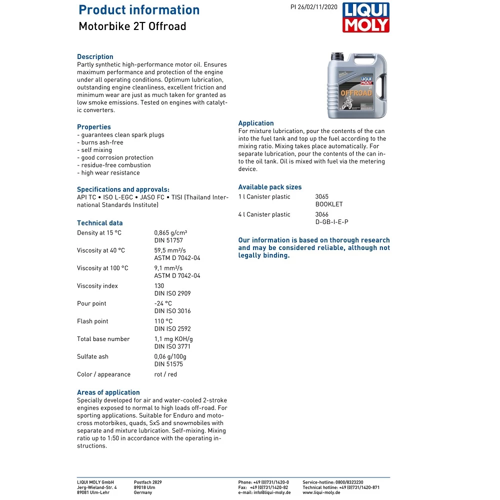 The Liqui Moly engine oil has been specially developed for air and water-cooled 2-stroke engines exposed to normal to high loads off-road. For sporting applications. Suitable for Enduro and motocross motorbikes, quads, SxS and snowmobiles with separate and mixture lubrication. Self-mixing. Mixing ratio up to 1:50 in accordance with the operating instructions.