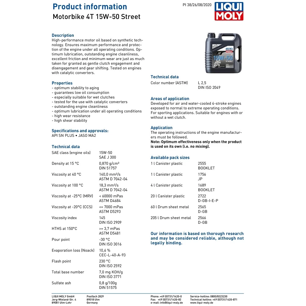 The Liqui Moly motorcycle engine oil has been developed for air and water-cooled 4-stroke engines exposed to normal to extreme operating conditions. For sporting applications. Suitable for engines with or without a wet clutch.