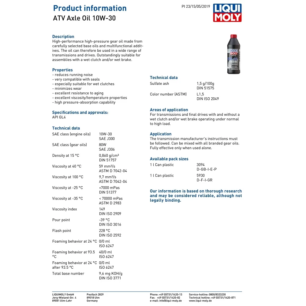 The Liqui Moly ATV Axle 10W-30 oil is a high-performance & high-pressure gear oil, made from carefully selected base oils and multi-functional additives. The oil can therefore be used in a wide range of transmissions and drives. Outstandingly suitable for assemblies with a wet clutch or wet brake, as well as for transmissions and final drives with and without a wet clutch or wet brake, operating under normal to high load.