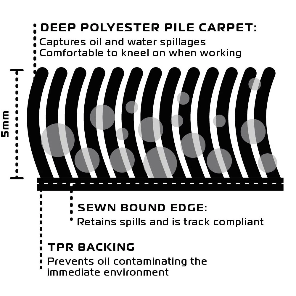 The Oxford Adventure motorcycle workshop garage mat completes your home setup, and ensures that your bike has a comfortable home. A workshop mat is an essential tool designed to absorb minor oil spillages in the garage, and in turn help keep to keep a tidy and safe workshop. The motorbike garage mat is constructed from a strong and durable 100% polyester deep pile carpet, backed with a TPR rubber and sewn bound edges. As well as being comfortable to kneel on, these features prevent oil and fluids from contaminating the immediate environment.