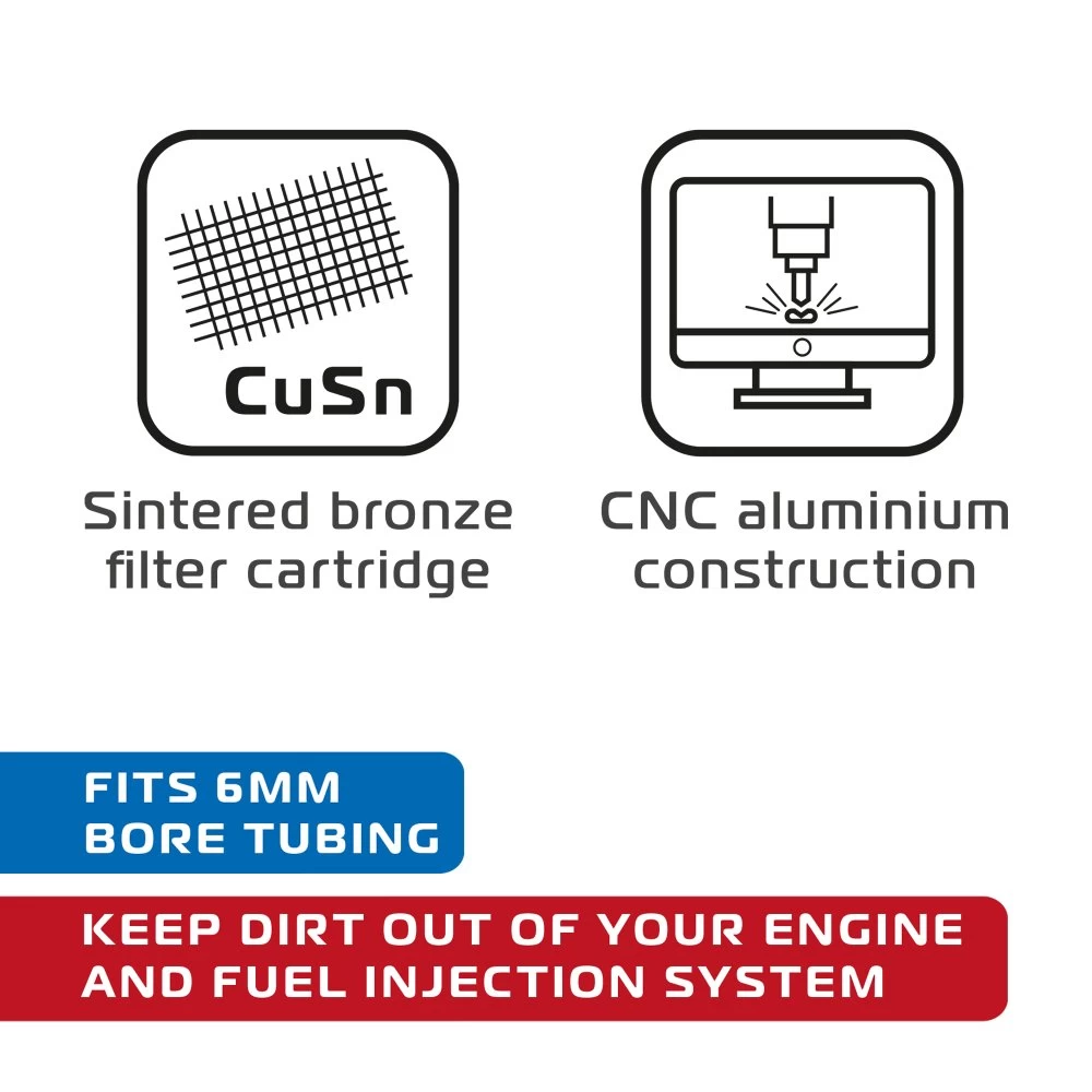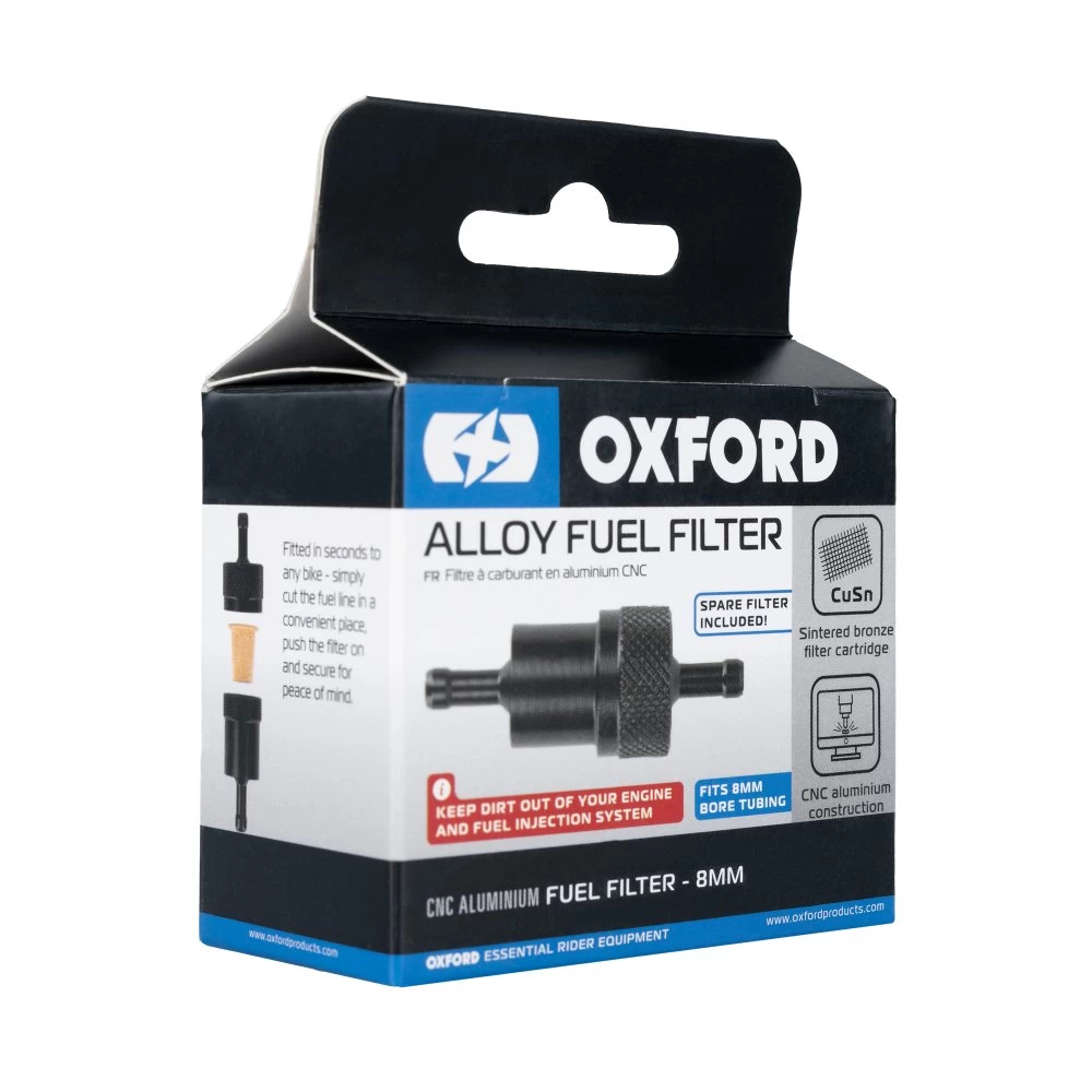 Keep dirt out of your engine and fuel injection system by fitting the Oxford alloy motorcycle fuel filter. This motorbike filter can be fitted in seconds to any bike or scooter effortlessly. Simply cut the fuel line in a convenient place, push the filter on and secure in place for peace of mind.