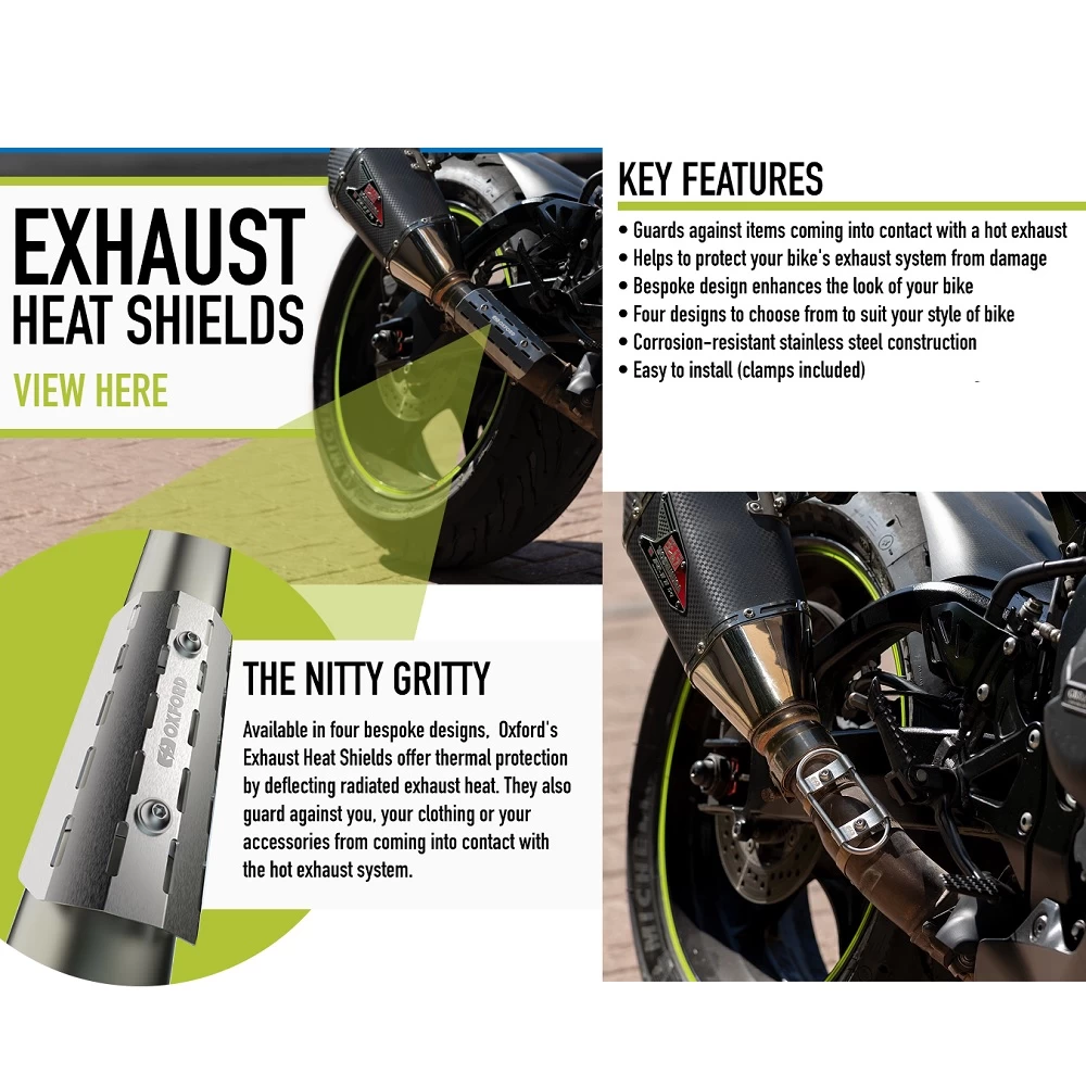 The Oxford Cafe Racer motorcycle exhaust heat shield offers thermal protection by deflecting radiated exhaust heat and guards against yourself, your clothing or your accessories from accidentally touching a hot exhaust system. The motorbike exhaust heat shield is supplied with adjustable clamps so it can be fitted to a variety of different sized exhaust pipe diameters. Available in four bespoke designs to suit the style of your bike: Cafe, Street, Sport and Scrambler.