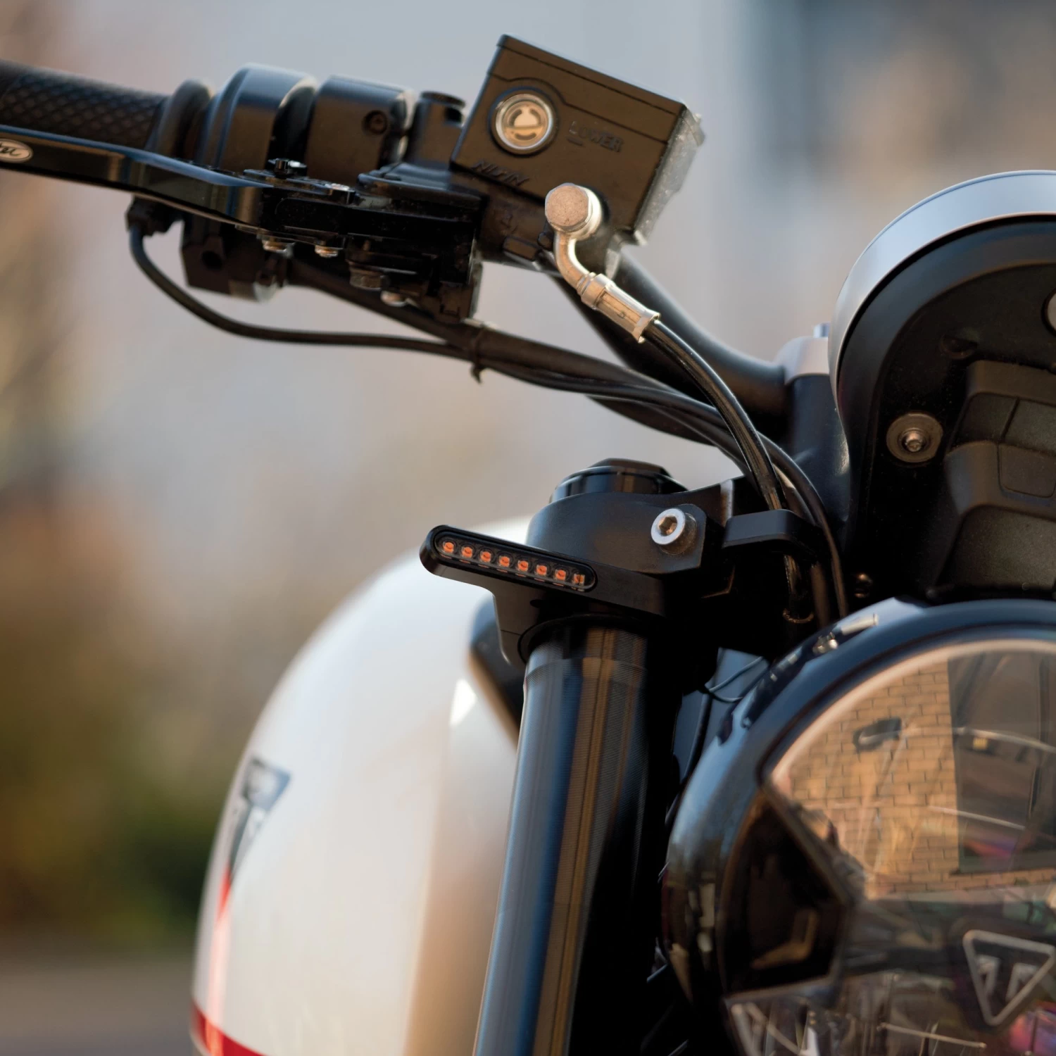 Sometimes your indicators don’t make the cut, so level up today with the Oxford DarkTurner sequential motorcycle indicators. Effortlessly relocate your indicators to your motorcycle forks and change the look of your bike. The motorbike indicators are also sequential, which dynamically sweeps from the inside to the outside of the indicator strip. With silicone spacers included, the indicators fit a wide variety of bikes with fork diameters from 45 to 60 mm. Constructed with CNC aluminium, the fork mounts are a premium bit of kit designed to last.