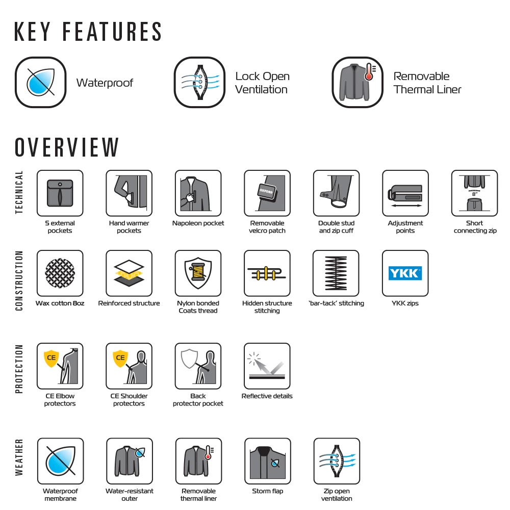If you’re after a throwback without compromising on modern day features and safety, then the Oxford Hardy wax motorcycle jacket is perfect for you! Classically styled, the Oxford Hardy wax jacket offer plenty of pockets to carry your belongings everywhere with you and safety is provided through CE approved Armour in both the shoulders and elbows. A removable and washable quilted thermal liner ensures that you can wear the jacket all year round. The Oxford motorcycle jacket is CE Approved (A rating).