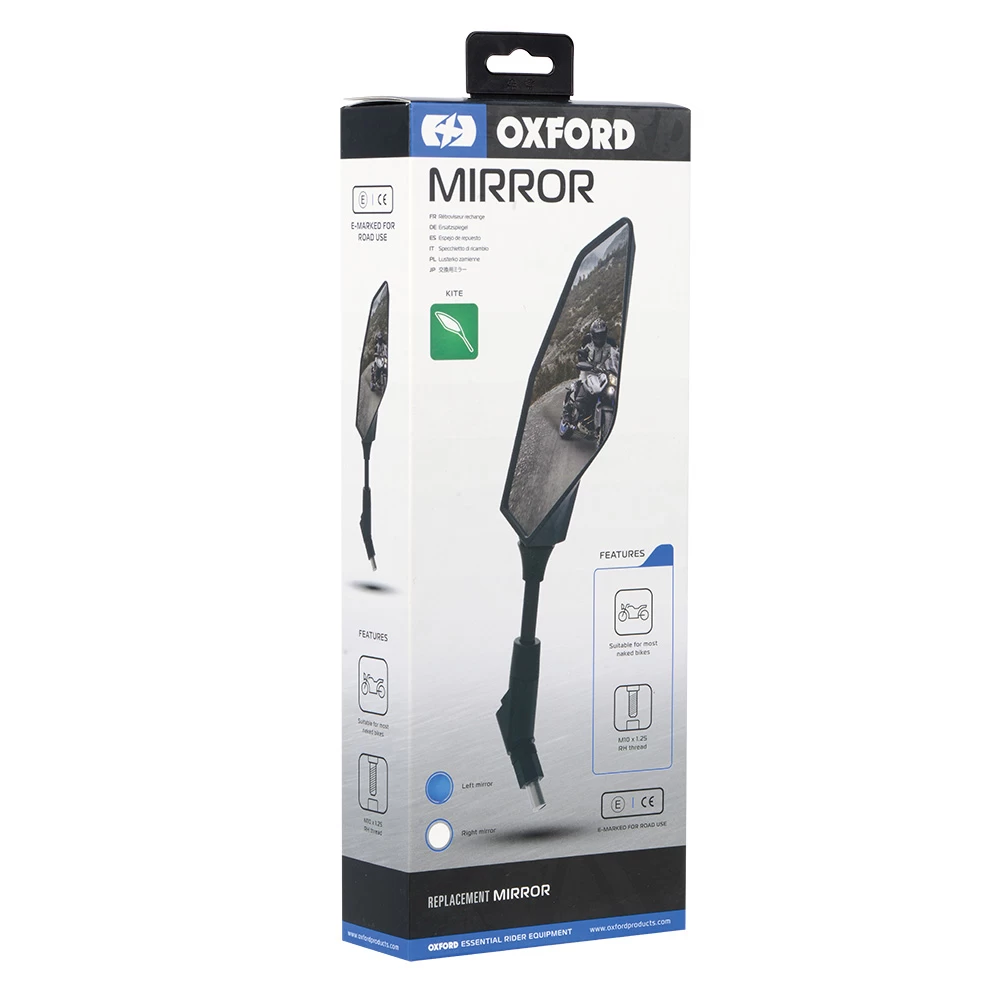 The Oxford Kite left hand motorcycle mirror offers excellent visibility and convenience, and are a perfect replacement for most naked bikes. Style meets substance with the elegant design of the motorbike mirrors which have a universal design for both motorcycles and scooters. The mirror comes equipped with an M10 (1.25) thread fitment. Constructed using anodized aluminum you can rest assured you’re receiving a high standard build, as you now come to expect with Oxford motorbike gear and accessories.