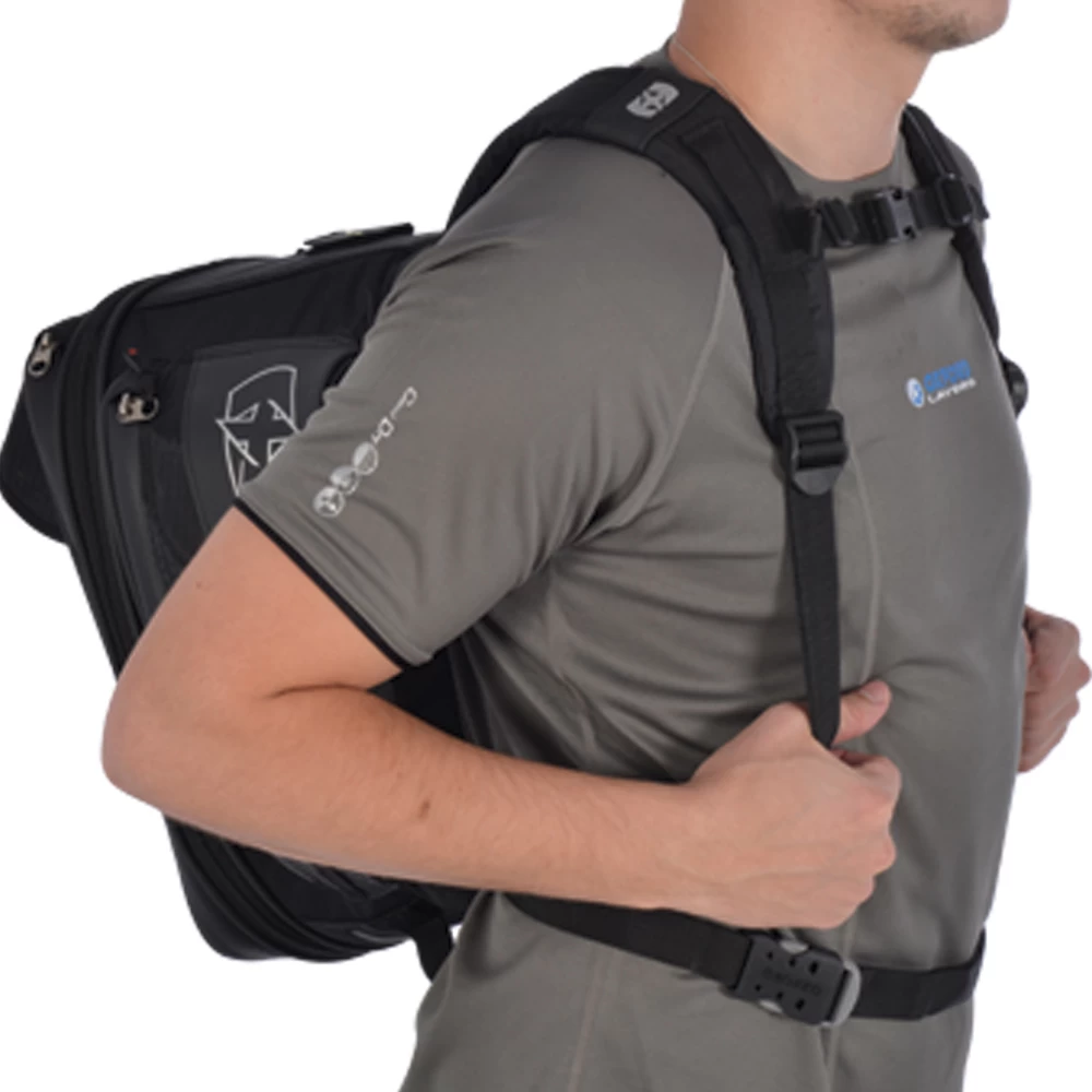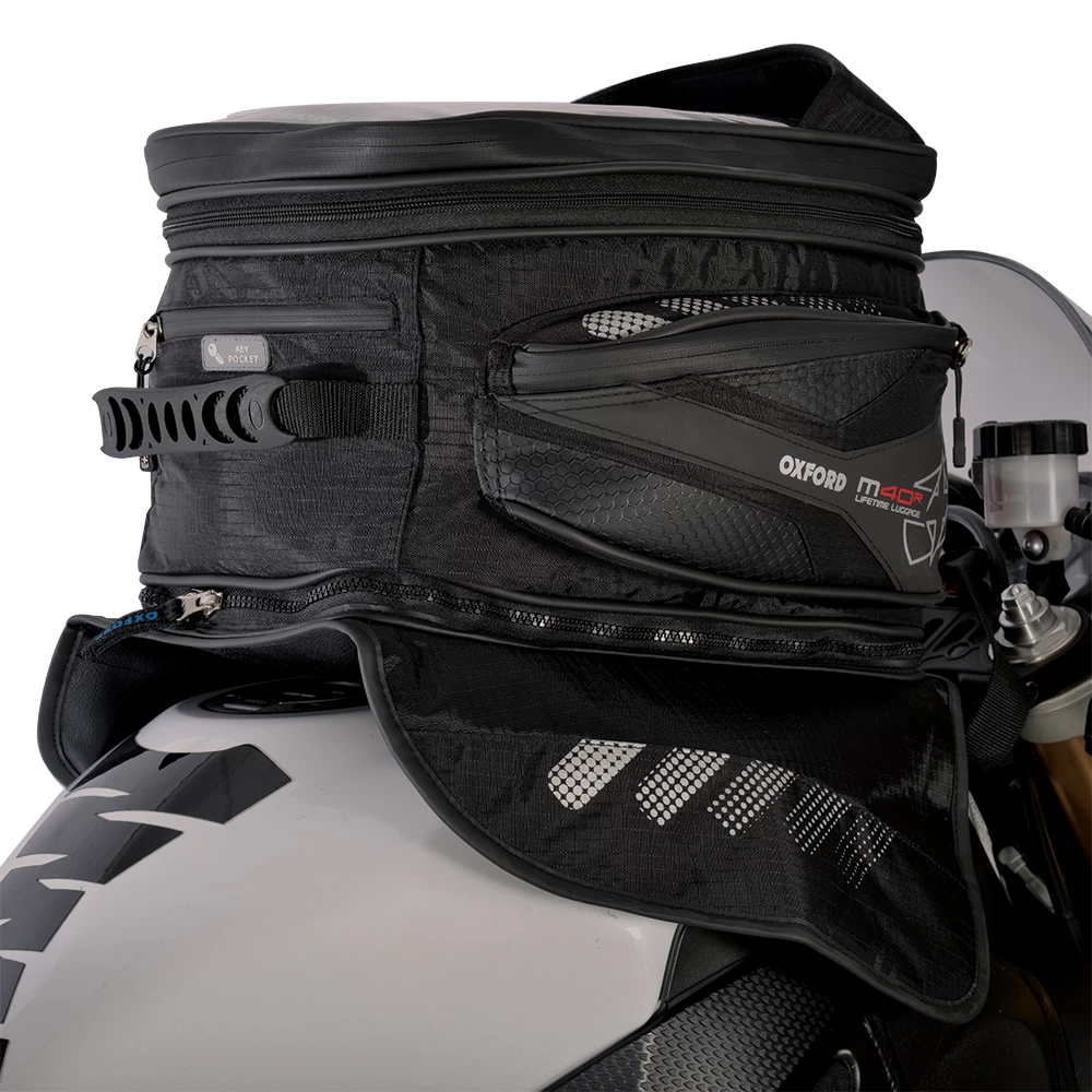 The Oxford M40R motorcycle tank bag is a stylish, multi-functional, magnetic motorbike tank bag with a whole host of innovative features including a map and Sat Nav holder. The Oxford motorcycle tank bag is big enough to carry a full face helmet when expanded and is also equally capable of swallowing up enough gear for a weekend away. Suitable for most motorcycles with steel tanks.