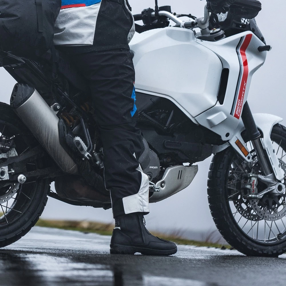 Large upper leg vents are now easily opened and fastened open with one hand, without even needing to look at them. In addition to the water-resistant zippers, clever fabric techniques create rain channels that further prevent rain ingress. Semi-auto lock zippers ensure the flap remains closed when not in use. The waterproof touring trousers are available in a range of colours to match any riders gear, bike and personal taste!