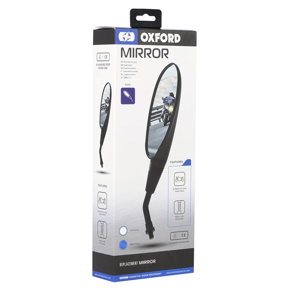The Oxford Oval right hand motorcycle mirror offers excellent visibility and convenience, and are a perfect replacement for most naked bikes. Style meets substance with the elegant design of the motorbike mirrors which have a universal design for both motorcycles and scooters. The mirror comes equipped with an M10 (1.25) thread fitment. Constructed using anodized aluminum you can rest assured you’re receiving a high standard build, as you now come to expect with Oxford motorbike gear and accessories.