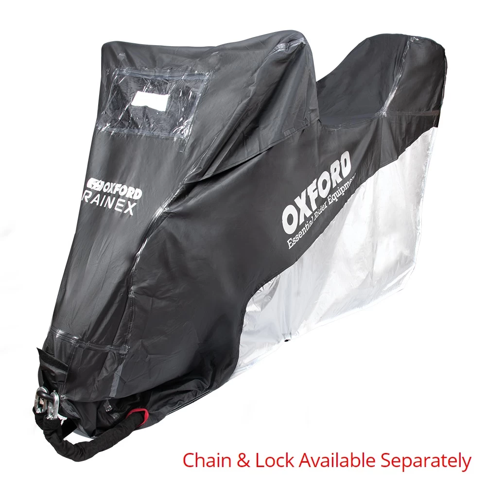 Looking for a new home for your pride and joy? Then look no further than the Oxford Rainex top box waterproof motorcycle cover. A premium waterproof cover to Designed to withstand serious rain, the Rainex will offer protection in the wind & rain. With excellent features that aim to protect your ride effortlessly, including externally bonded seams to protect from the rain, alongside a tough outer that protects against the weather and small knocks. An adjustable belly strap and a lock pouch will help keep the Rainex in place. Every cover is sold with a carry case, allowing you to store the cover away when not in use, and even take it with you should you be planning to stay somewhere else for the night. Suitable for both indoor and outdoor use, and available in a range of sizes to fit most motorcycles and scooters.