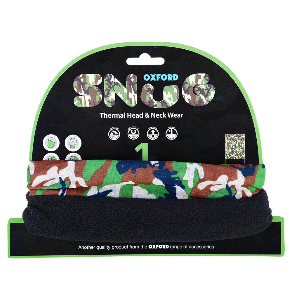 The Oxford Snug Camo green motorcycle neck warmer is a versatile and thermal option for riders looking to battle windchill and the cold. The snug provides all-year comfort with extra warmth for the winter weather. The snug can be worn either as a beanie, face mask, neck tube, bandanna or balaclava depending on your own personal preference. Available in a range of colours to suit any riders taste and gear.