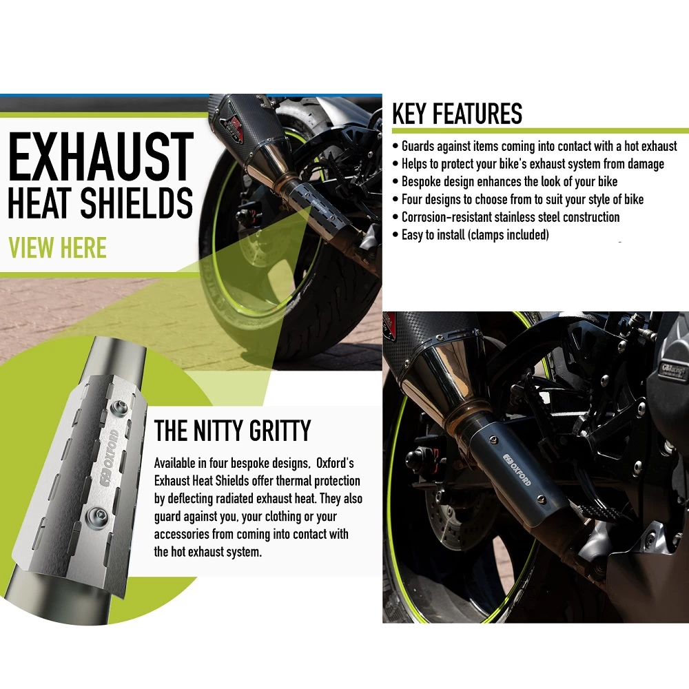The Oxford Sport motorcycle exhaust heat shield offers thermal protection by deflecting radiated exhaust heat and guards against yourself, your clothing or your accessories from accidentally touching a hot exhaust system. The motorbike exhaust heat shield is supplied with adjustable clamps so it can be fitted to a variety of different sized exhaust pipe diameters. Available in four bespoke designs to suit the style of your bike: Cafe, Street, Sport and Scrambler.