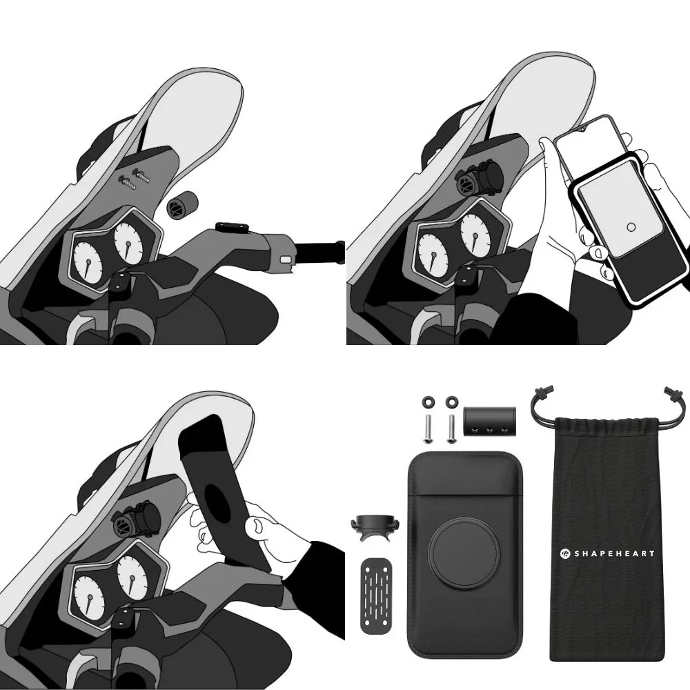 The Shapeheart magnetic scooter phone holder is a great all in one choice for riders who like to keep it simple without compromising on quality. Easy to install and easy to use. Immediately protect your phone from the rain, while providing an exceptionally stable hold on any road. The magnetic connector is incredibly strong, and as it’s holding your phone the kit has been put through it’s paces! It can hold up to 50 times the weight of your standard smartphone, and remains stable even at high speeds. Effortlessly fixes to the plastic parts of your scooters dashboard or in the middle of your handlebar.