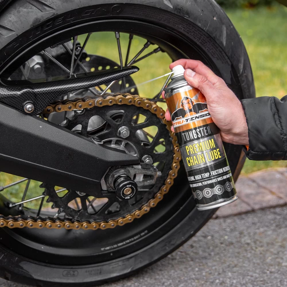 The Tru-Tension Tungsten Premium motorcycle chain lube is a supremely slippery compound which reduces friction which makes it perfect for high mileage and commuting bikes.